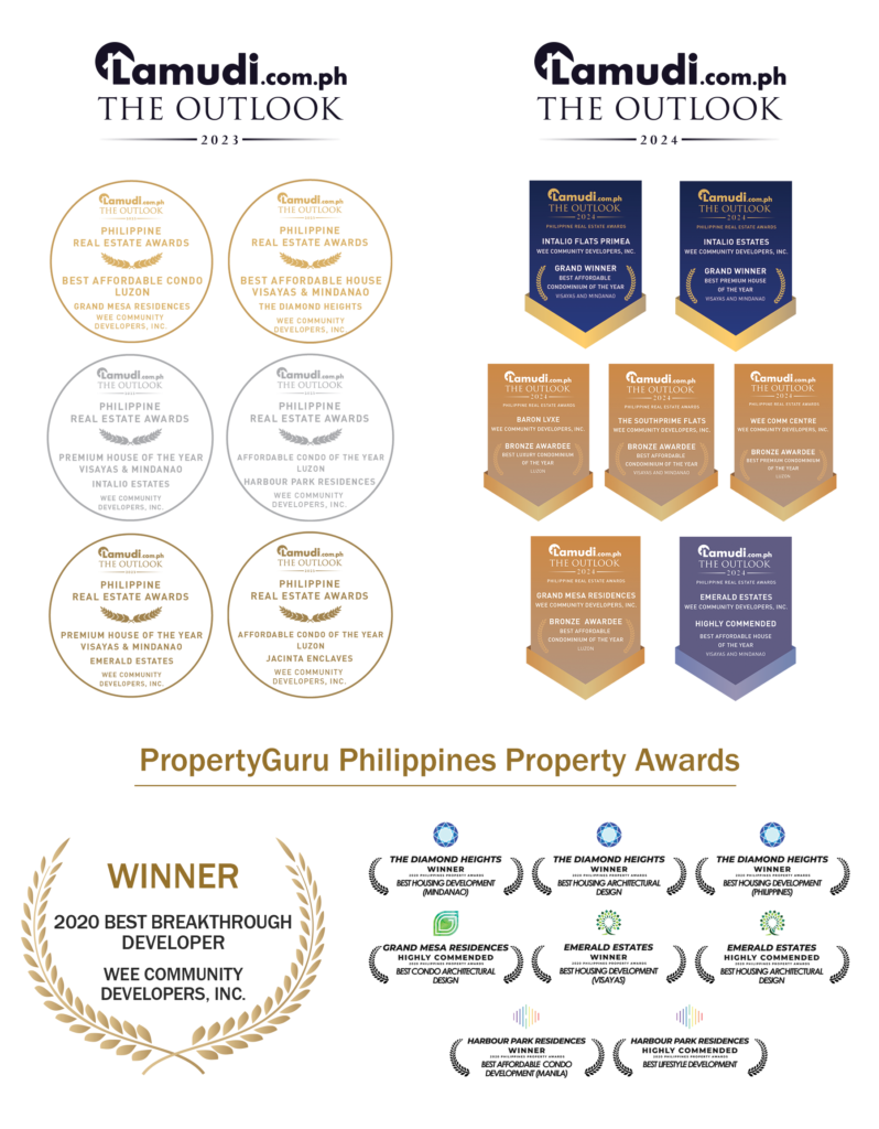 Through consistency, effort, and our commitment to bringing our clients Beyond Ordinary™ homes, Wee Comm has bagged several awards from the prestigious 2020 Philippines Property Awards and Lamudi The Outlook 2023 & 2024: Philippine Real Estate Awards.